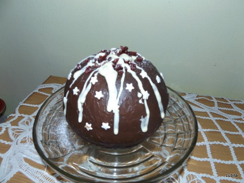 Dupa ce blaturile s-au copt si racit,se face o gaura in partea plata cu o adancitura de 4 cm.Se umple fiecare cu branza si se intinde si la suprafata, pentru ca jumatatile sa se lipeasca mai usor; se aseaza bomba pe un gratar,se toarna ganach-ul, se uniformizeaza toata suprafata si se lasa la frigider 30 minute.Dupa acest timp, se scoate prajitura si se mai toarna ganache acoperind spatiul dintre cele doua blaturi.Se lasa din nou la frigider; dupa ce s-a intarit ciocolata, se transfera pe un platou. Se topeste la microunde restul de ciocolata alba, se toarna peste prajitura, se presara merisoare si stelute decor.