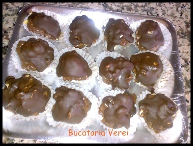 Luam o tava tapetata cu hartie,asezam gramajoare din compozitia pregatita,asezam o aluna intreaga pe fiecare gramajoara,si introducem tava in frigider cam 10 minute;
