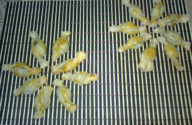 adaugam semintele de chia si de dovleac. Foaia de aluat o taiem dreptunghiuri pe care le mai intindem cu sucitorul Luam fiecare dreptunghi de aluat, punem o lingurita de compozitie de spanac in mijlocul dreptunghiului, aducem fiecare margine peste umplutura, apoi rasucim la capete precum bomboanele de pom. Asezam bomboanele in tava tapetata cu hartie de copt, le ungem cu ou batut si dam la cuptorul preincalzit pana se rumenesc frumos. Pofta buna!