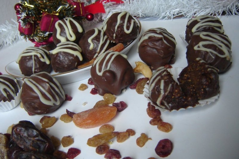 Toate fructele,in afara de curmale, se pun la rehidratat,in apa cu esenta de rom.Curmalele se curata de samburi si impreuna cu celelalte fructe,rehidratate,se dau prin blender,cat mai marunt.Peste pasta de fructe gata formata,se adauga coaja rasa de lamaie si esenta de rom. Se amesteca si se framanta apoi cu mana,rezultand,un "aluat" usor de modelat.Cu mainele usor umede se fac bilute pe care le tragem in ciocolata.Se pun la scurs pe un gratar si cand s-a intarit ciocolata neagra,se fac dare cu ciocolata alba.