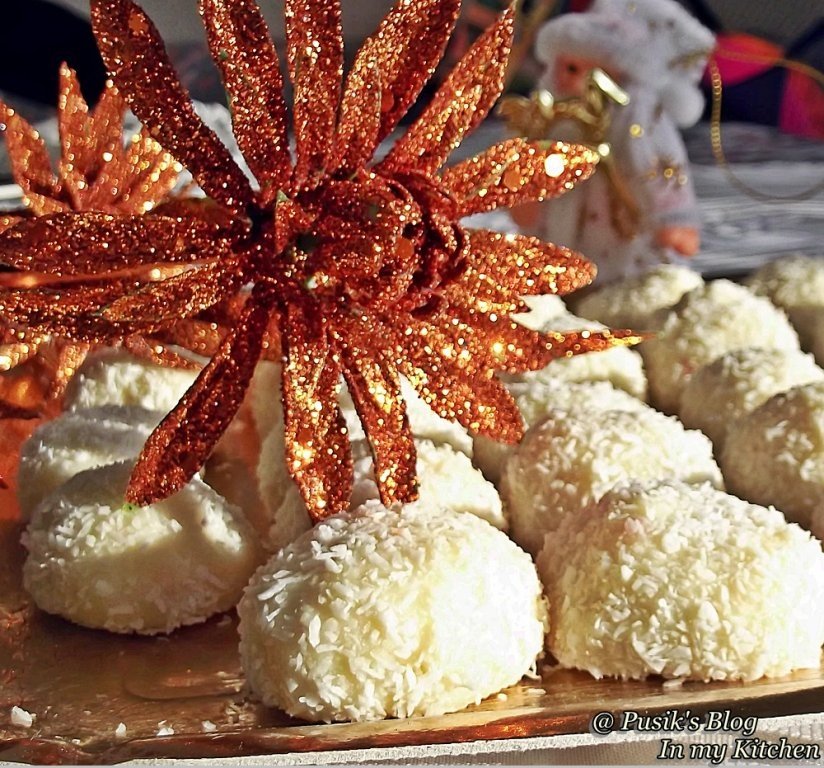 Dupa ce s-a racit formam bilute, iar in mijlocul lor punem samburi de nuca, dupa care dam prin restul de nuca de cocos.