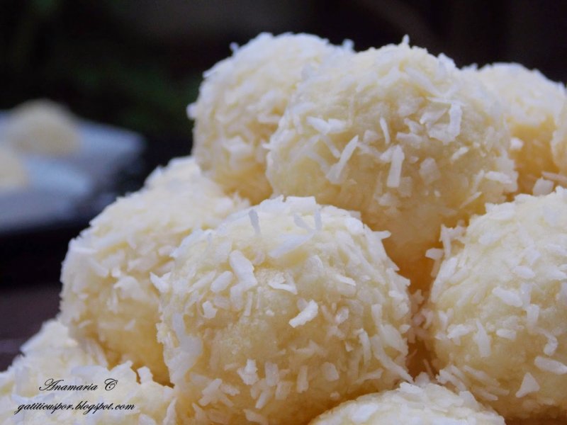 Cand zaharul si untul s-au topit stingeti focul si adaugati laptele praf, nuca de cocos si zeama de lamaie, amestecand pana se incorporeaza complet. Formati bile de marimea dorita (eu le-am facut cat o nuca) si impingeti o aluna in centru apoi tavaliti prin nuca de cocos. Puteti adauga si putina napolitana faramata in aluat pentru o consistenta mai crocanta.