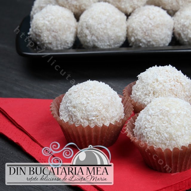 3. Bomboanele obtinute le glazuram cu ciocolata topita si apoi le tavalim prin fulgii de cocos. Le pastram la frigider.