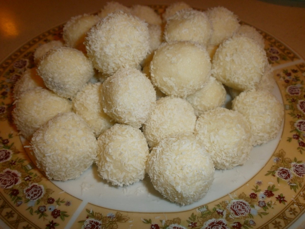 Se amesteca laptele condensat cu nuca de cocos pana ce se obtine o pasta din care se modeleaza bilute.