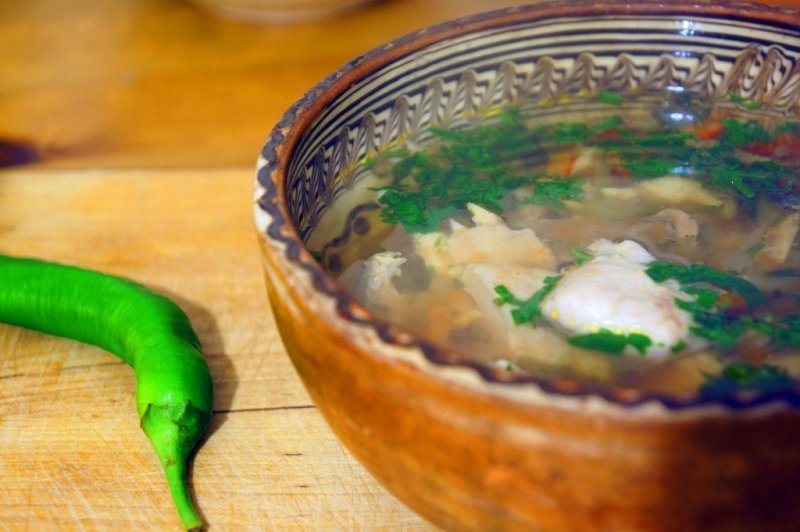 3. După ce începe să fiarbă, nu va dura mai mult de 10-15 minute până toată carnea de pe oase şi din căpățână să înceapă să se desprindă. Strecuraţi zeamă, scoateţi carnea de pe oase şi puneţi din nou la fiert. Adăugaţi ardeiul, ceapa şi ţelina tocate mărunt.
