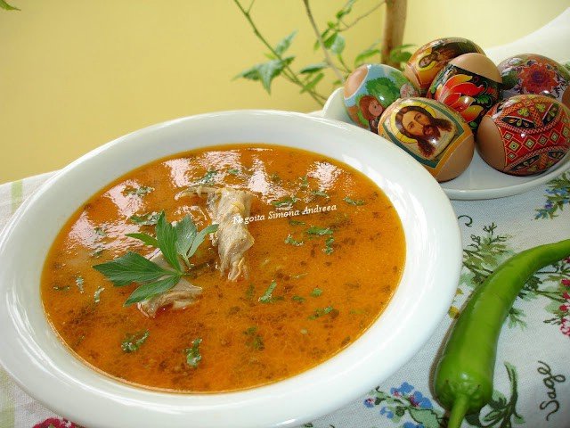 Se spala carnea, se pune cu apa rece si se lasa pe foc sa fiarba aproximativ 20 de minute timp in care se spumeaza. Se toaca ceapa marunt si se caleste partea alba, se adauga apoi morcovul dat prin razatoarea mica si dupa ce s-au calit se pun impreuna cu celelalte legume tocate in ciorba . Dupa 10 minute se adauga si ceapa verde. Cand legumele si carnea sunt fierte se aduga pasta de tomate dizolvata in zeama de ciorba si se mai lasa 10-15 min la fiert. Se pune borsul dat in clocot separat si se amesteca galbenusurile cu smantana. Se adauga treptat din zeama peste smantana ca sa ajunga la aceeasi temperatura si sa nu se taie. Se opreste focul, se pune smantana in oala, leustean si tarhon dupa care se acopera