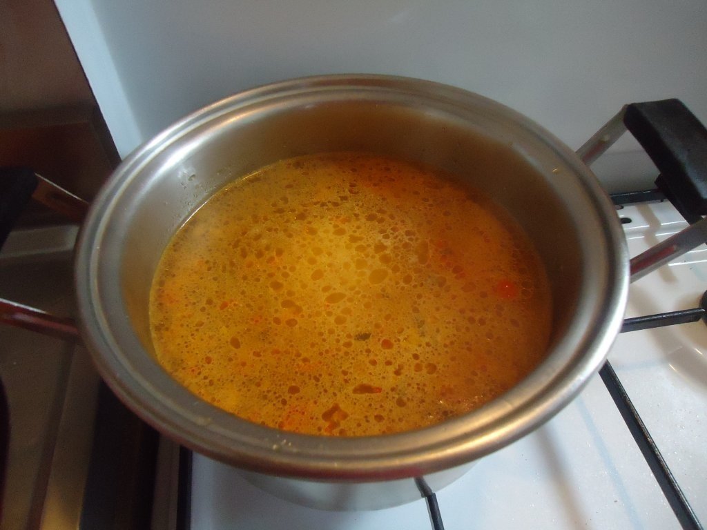 Asez carnea curatata in apa rece,las sa dea un clocot. Schimb apa, adaug legumele si condimentele. Cand carnea este fiarta, strecor supa. Iau carnea de pe oase,o adaug in supa, odata cu legumele tocate marunt.