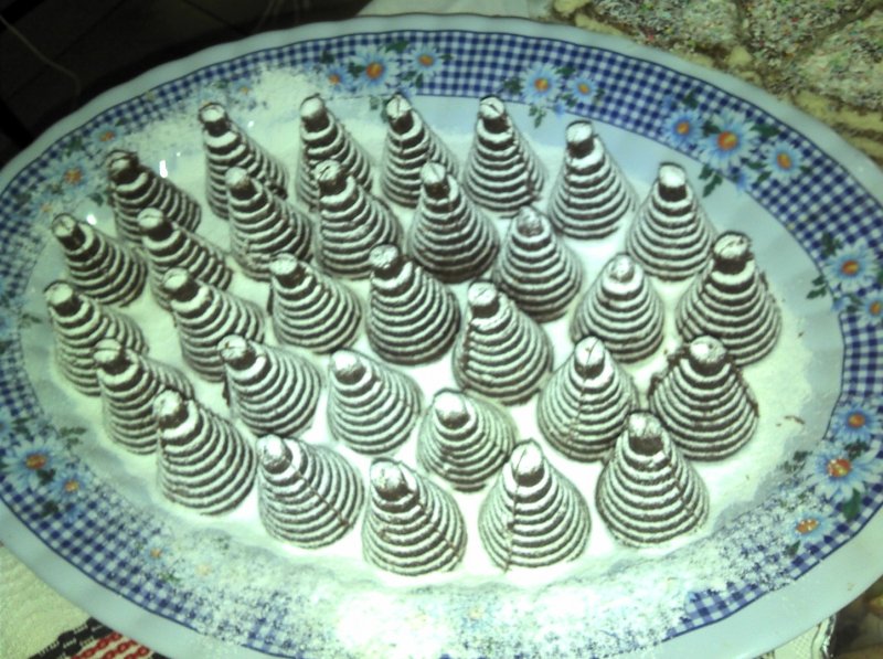 Biscuitii se macina fin. Se topeste margarina si se amesteca toate ingredientele. Se dau la rece cca. 1 ora, dupa care se modeleaza prajiturelele cu o forma de bradut. Optional in centrul fiecareia se poate pune cate o visina. Se dau la rece si se pudreaza inainte de servire.