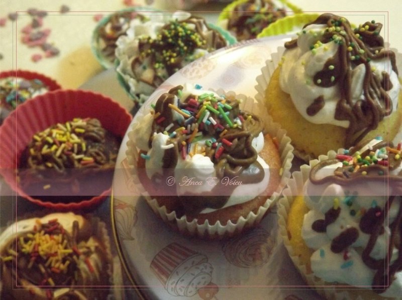 Se toarna din fiecare compozitie in formele de briose in care am pus si forme de copt, insa nu umplem formele.