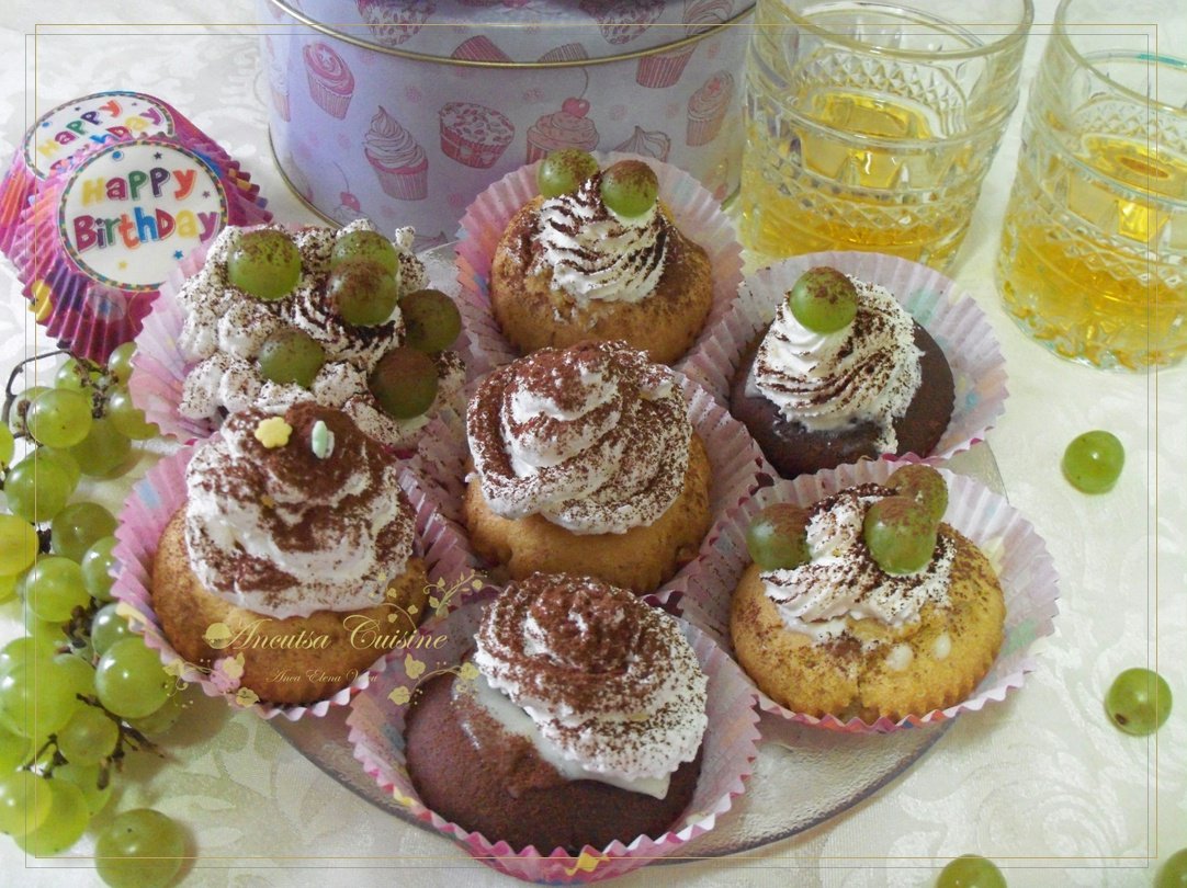 Briosele in diferite culori si arome sunt preferatele familiei mele, asa ca de aceasta data am pregatit briose de toamna cu crema de vanilie, frisca, branza si struguri.