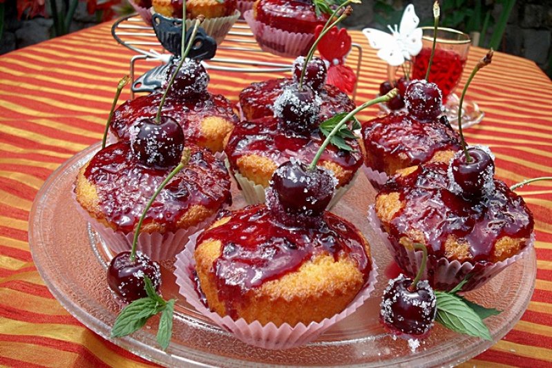 Intre timp regatim glazura dand in cateva clocote zaharul cu piureul e cirese apoi dam craticioara sa se racoreasca putin.Glazura se toarna calduta deasupra brioselor pe care le-am scos din forme si le-am lasat sa se raceasca bine,apoi se decoreaza cu ciresele oprite.Se da putin la rece sa se intareasca putin glazura.