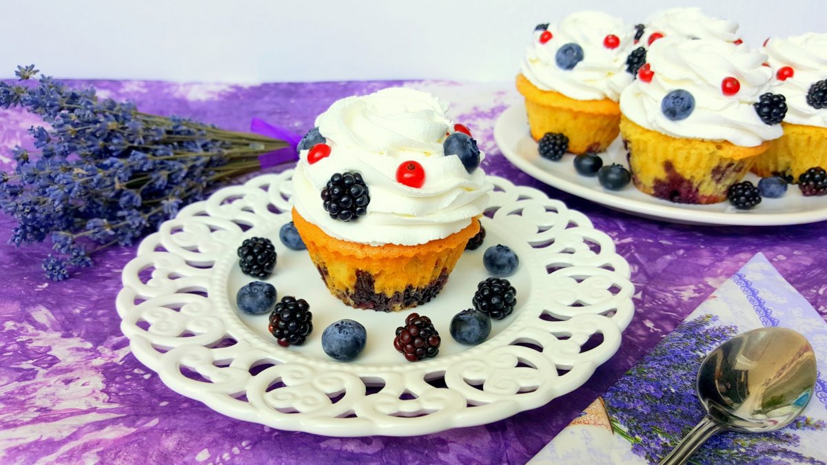 Se mixeaza frisca si cu ajutorul unui posh se orneaza briosele, apoi se decoreaza cu fructele de padure ramase, dupa preferinta.