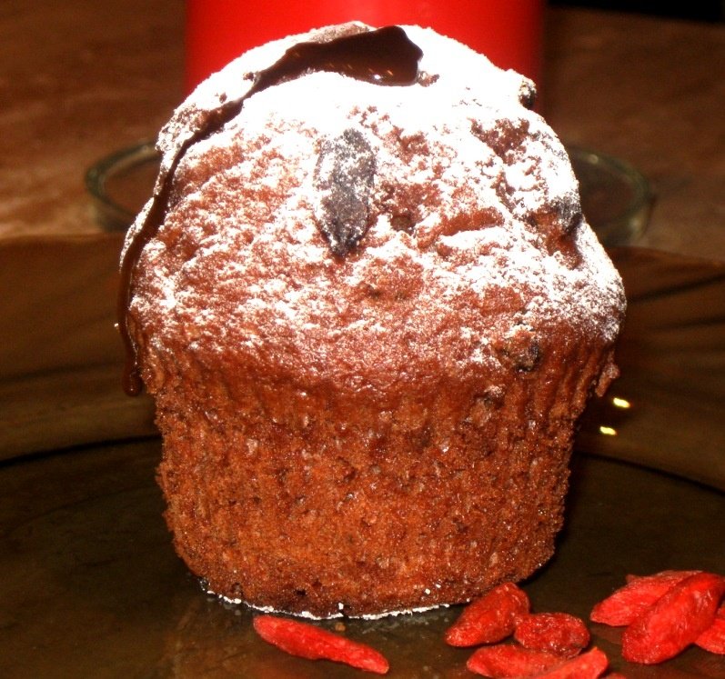 Se pun intr-un vas pe rand ouale,zaharul,zaharul vanilat uleiul , laptele si cacao si se mixeaza bine.Se adauga putin cate putin faina in care am pus si praful de copt.La final se adauga si fructele goji se se amesteca bine pentru o buna omogenizare.Acest amestec se toarna in forme de briose(pe care le-am captusit in prealabil cu hartie pentru briose) ,deasupra am mai pus cateva fructe goji si se da la cuptor.Se face testul scobitorii si cand sunt gata coapte se scoate din cuptor , se lasa sa se raceasca si................pofta buna.