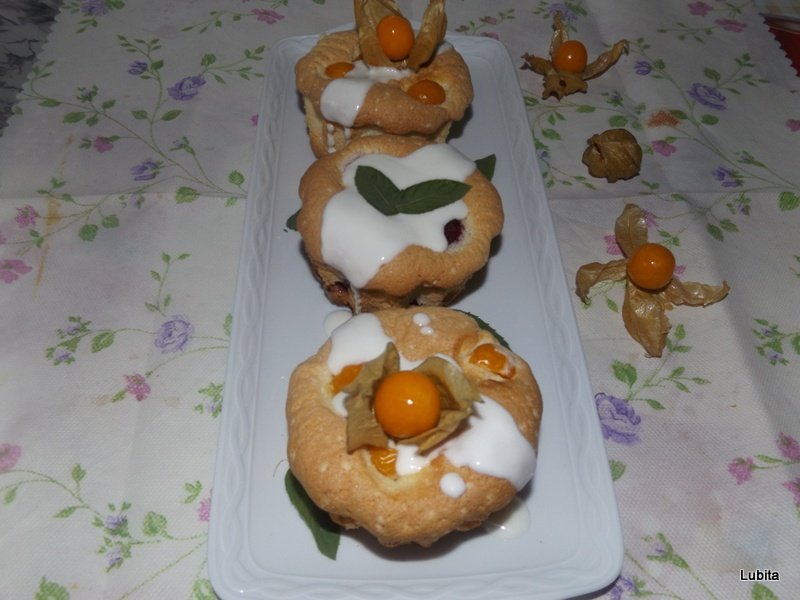 In formele de briose se pune o lingura cu aluat,apoi fructe amestecate sau separat, se acopera cu alte doua linguri cu aluat iar deasupra se impart fructele ramase. Se lasa la cuptor 30 minute, pana se rumenesc, iar dupa ce s-au racit se scot si se pun pe un platou. Se toarna deasupra glazura pregatita dupa instructiunile de pe plic si se orneaza cu fructe.