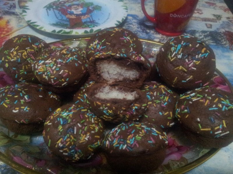 Batem albusurile cu zaharul, adaugam nuca de cocos, esenta si amestecam bine, rezulta o pasta groasa. Punem cu lingura cate putin aluat in forme, punem cate o lingura de crema si acoperim din nou cu aluat cat e forma de briosa.