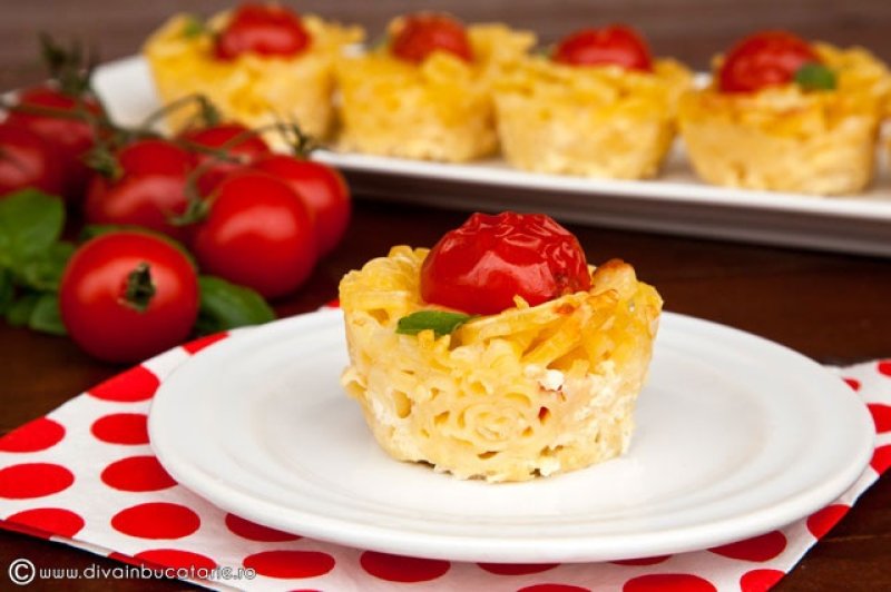 Pregatim ingredientele astfel incat sa le avem la indemana si sa terminam repede briosele. Punem pastele la fiert in apa cu sare si le fierbem conform instructiunilor de pe pachet. Cat timp se fierb acestea ungem formele de briose cu ulei, apoi le tapetam cu pesmet (in strat generos pe fundul formei). Cand pastele sunt fierte le scurgem, apoi punem un strat in forme, acoperind peretii si fundul. Punem un rand de cubulete mici de sunca, mozzarella si cuburi foarte mici dintr-o rosie cherry. Acoperim cu un rand de paste, asezam iar un strat de mozzarella si un strat final de paste. Batem un ou cu smantana, sare si piper si turnam cate o lingura (sau mai mult) peste fiecare compozitie de paste din forme. Pe fiecare briosa de paste asezam cate o jumatate de rosie cherry. Coacem briosele in cuptorul preincalzit la 200°C timp de 10 minute, sau pana se topeste mozzarella ce va lipi pastele intre ele si se coace oul batut cu smantana.