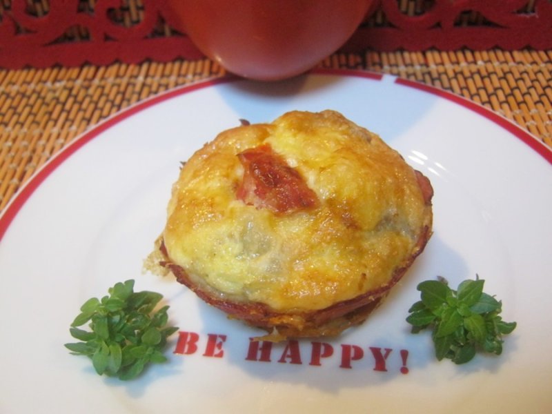 Feliutele de prosciutto crudo le asezam pe lateralele formelor de briose, apoi punem in forme cate o lingura din compozitia oualor batute, cuburile de friptura si de cartofi.
