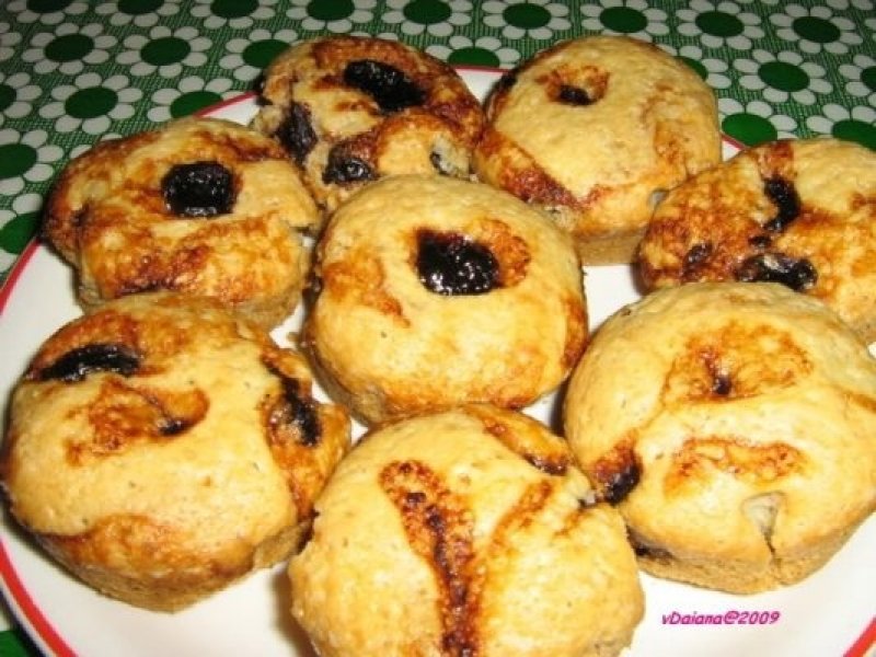 In formele de briose am pus cate o lingura si ceva de aluat, apoi cate un pic de umplutura.