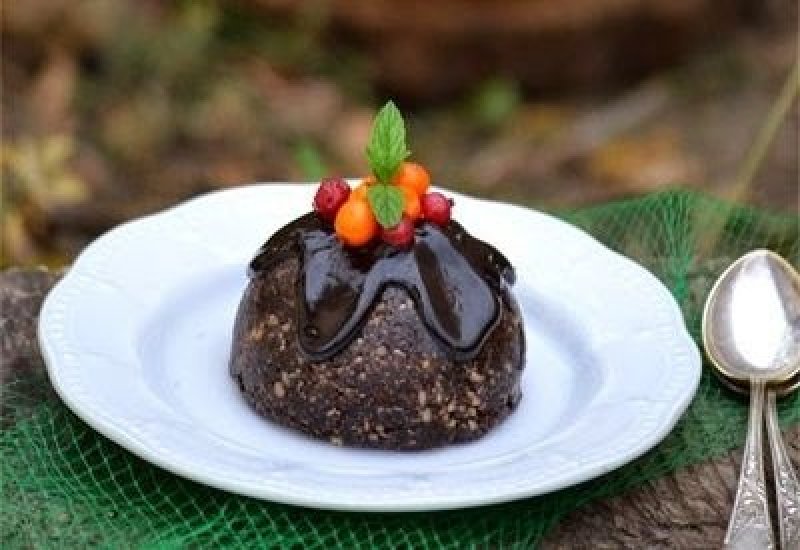 Se decoreaza cu ciocolata raw si se orneaza cu fructe proaspete (coacaze si catina am folosit eu ).