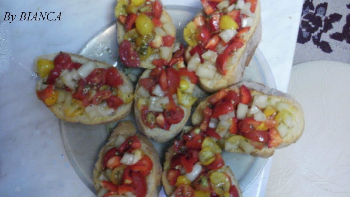 Cand painea este gata, luati un catel de usturoi si frecati-l de fiecare felie de paine, apoi stopiti-le cu ulei de masline si incepeti sa asezati cu atentie legumele pe paine.