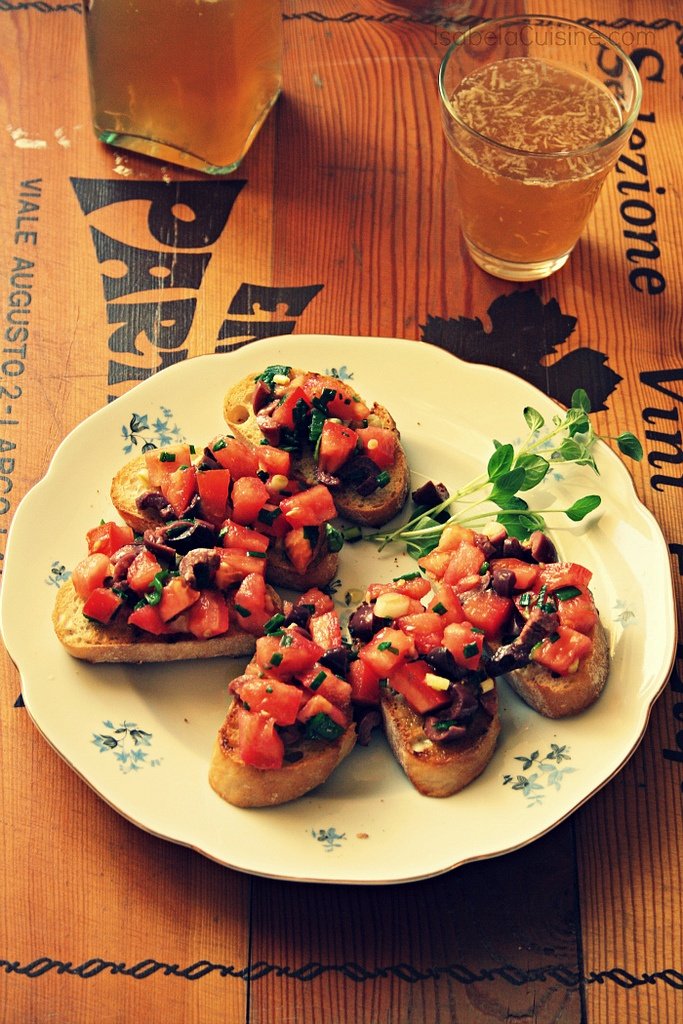 In acest timp taiati rosiile cuburi, maslinele si ele cat puteti de marunt. Le aruncati intr-un bol cu verdeata si ulei de masline. Puneti minunatia asta peste feliile de paine prajita si serviti imediat, cat sunt calde si crocante.