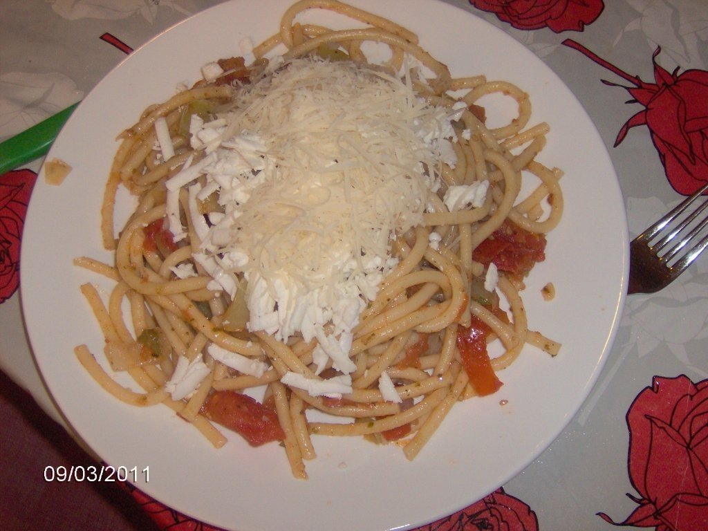 Intre timp incalzim o tigaie wok si incalzim uleiul de masline adaugam ceapa si o rumenim putin,adaugam ardeii si ii prajim putin si la sfirsit adaugam rosiile taiate cuburi si amestecam.Lasam putin ca gusturile sa se contopeasca adaugam sare,piper si putin zahar.Nu trbuie de lasat mult ca rosiile sa nu se faca pasta - se pun si frunzele de zahatar si se adauga pasta se amesteca putin cu legumele dupa care se adauga brinzeturile si se serveste.Eu pun brinzeturile aparte pe masa si pasta cu legume aparte.Fiecare isi pune brinza cit doreste.Este gustoasa pasta cu legume si foarte usor de facut.