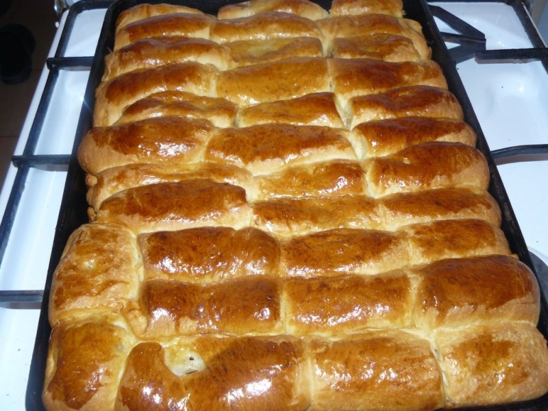 Se întinde aluatul subţire, se taie fâşii, apoi pătrăţele. Se pune umplutura în mijloc, se acopera cu aluatul si se pun una lângă alta în tava unsă cu ulei.