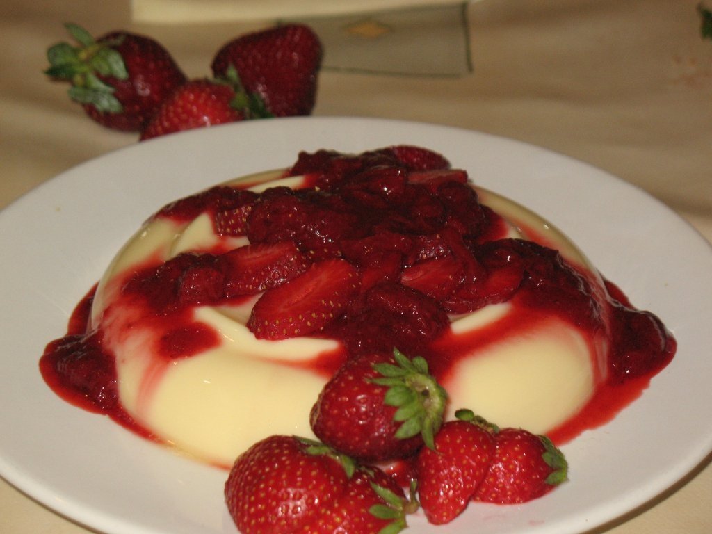 Se spala si se curata capsunile. Se opresc cateva iar restul se taie si se pun intr-un bol cu 50g zahar. Daca se serveste imediat, se zdrobesc capsunile cu zaharul ca sa obtineti un sos (lasati si bucati mai mari) daca vreti sa fie pentru mai tarziu le puneti la foc sa fierba 2 minute. Se rastoarna budinca intr-o farfurie se toarna sosul de capsuni in centru si se orneaza cu capsunile ramase.