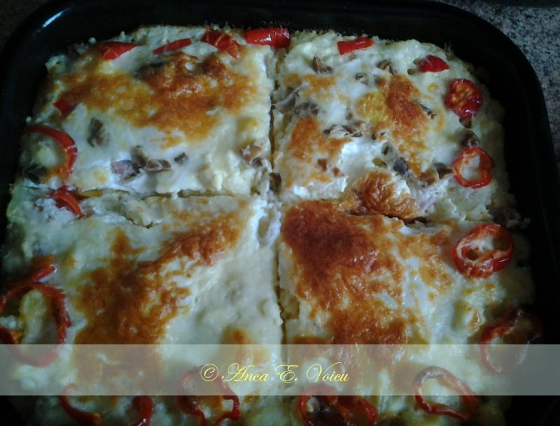 Se orneaza cu felii de ardei rosu, gustul dulce da o savoare minunata acestui fel de mancare.