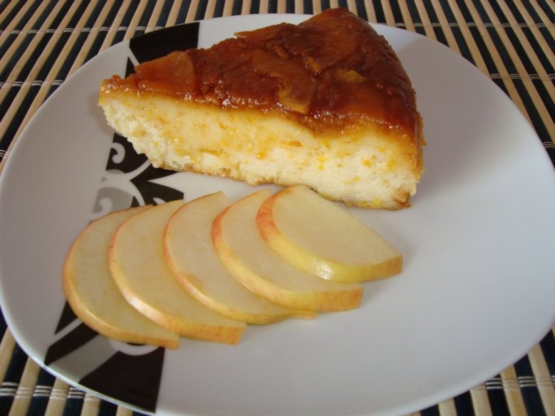 Intr-o oala se pun 100 g zahar unde se pune la caramelizat, cand e caramelizat se lasa la rece apoi se aseaza felii de mere, iar peste ele se toarna " terciul " obtinut anterior.