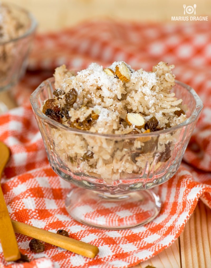 2. Cand este orezul gata incorporam stafidele, migdalele tocate si fulgii de cocos. Impartim budinca in castronele, turnam miere pe deasupra si mai presaram putin fulgi de cocos.