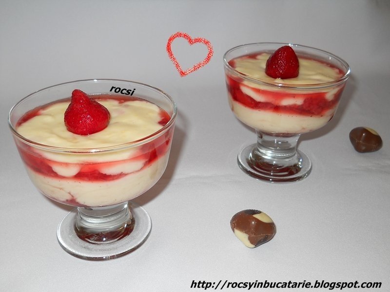 Pregatim niste cupe ,pe fundul lor punem o lingura piure de capsuni,apoi un strat de budinca,un strat de capsuni , deasupra iar putina budinca.