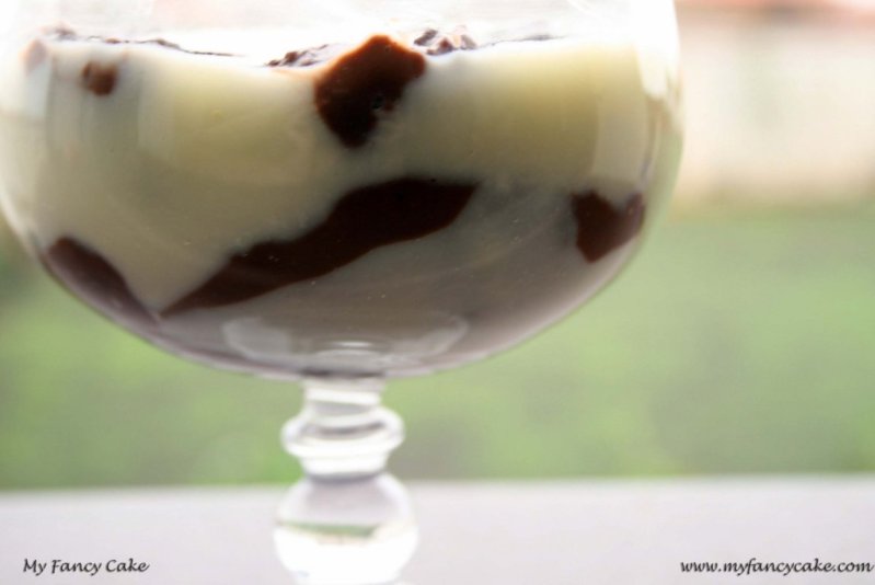 In momentul in care avem o consistenta groasa le tragem deoparte si adaugam cate o lingura de unt in fiecare. Amestecam energic si aranjam budinca in pahare: 1 lingura de vanilie, 1 lingura de ciocolata.... O servim rece.