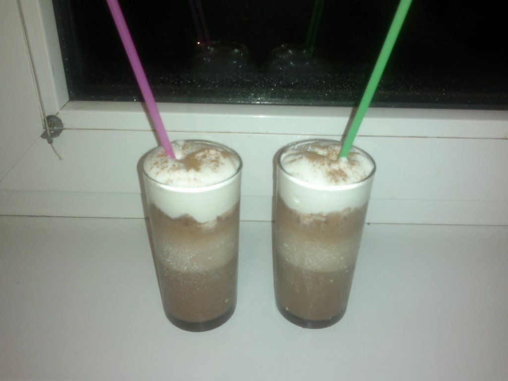 Se lasa aproximativ 1-2 minute, pana se decanteaza cafeaua de lapte. Se adauga frisca si se presara praf de scortisoara pe deasupra. Dupa gust, se poate adauga topping de ciocolata sau de caramel.
