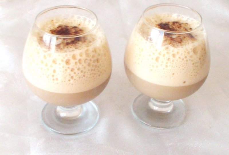 Pune intr-un mixer lapte adauga peste el zahar si cafea si se amesteca foarte bine.