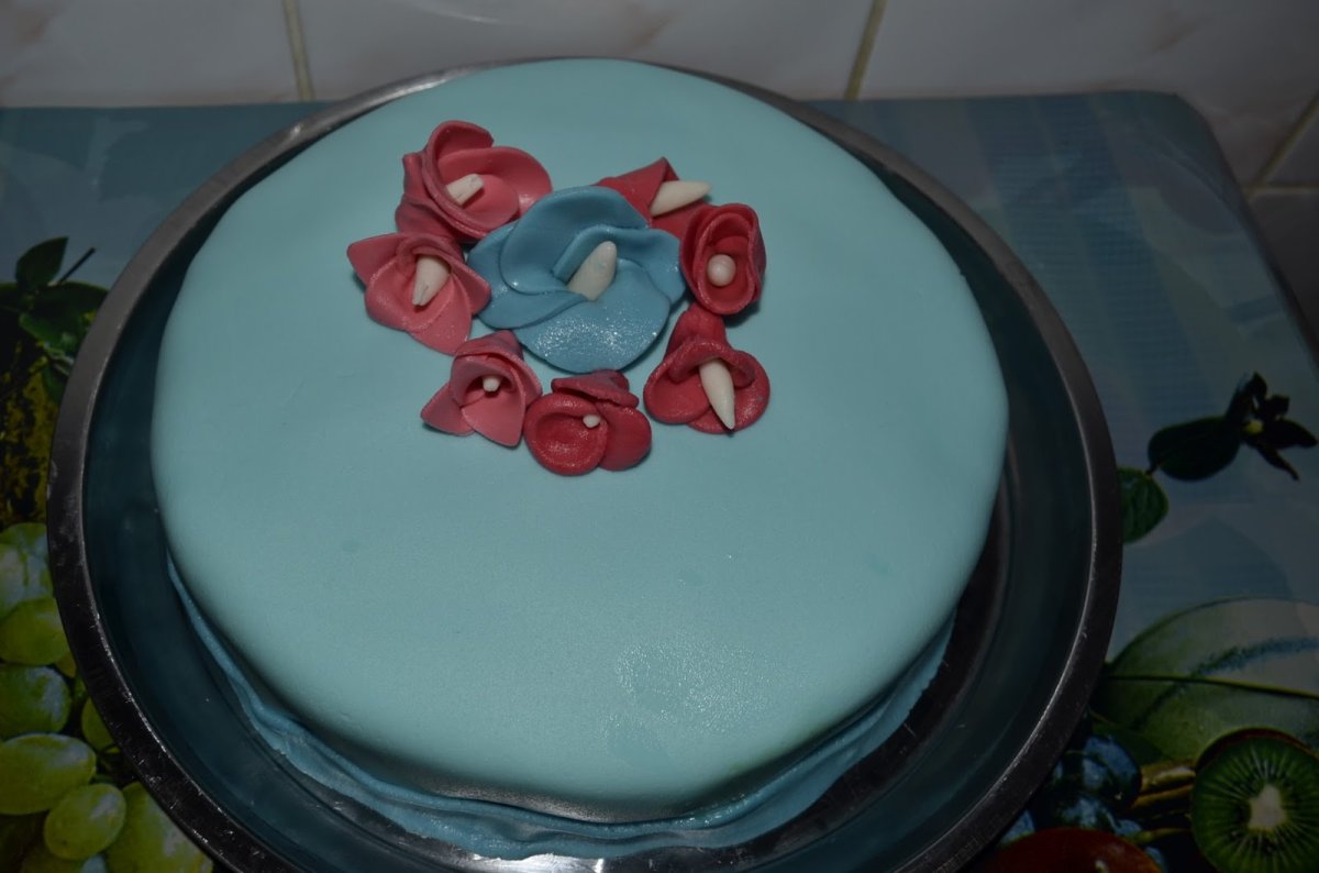 -Cernem jumatate din zahar,facem o gaura pe mijloc, turnam compozitia si amestecam cu lingura, adaugand putin cate putin din restul zaharului. Cand nu mai merge cu lingura,amestecam cu mana pana terminam zaharul. Punem compozitia pe un blat si il framantam pana obtinem o pasta cu aspect de plastilina si consistenta unei gume de mestecat. Invelim pasta in folie si o dam la frigider pentru cel putin 24 de ore dupa care o prelucram.