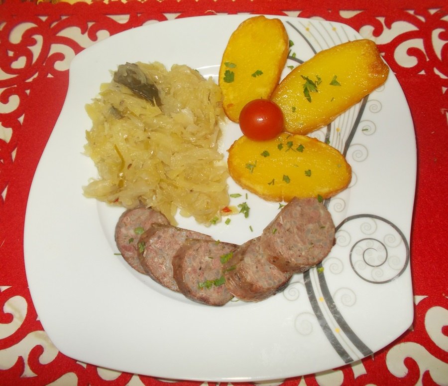 Cand toate sunt gata, servim felii de caltabos cu varza murata si cartofi copti.