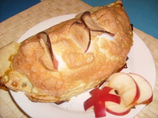 Pasul 3:Compozitia de mere se pune pe jumatate din foaia de aluat se acopera cu cealalta jumatate si se preseaza marginile pentru a se lipi