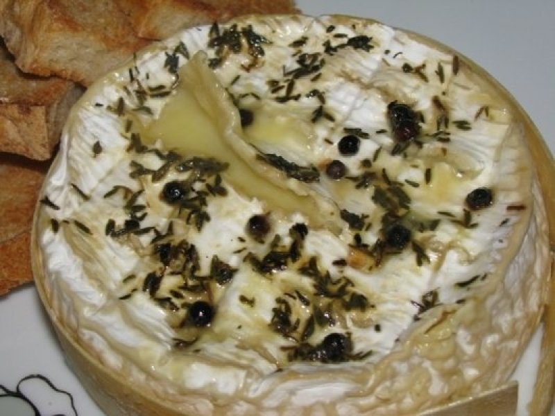 Scoate branza din cutie si inlatura folia cu care este impaturita.Aseaza branza inapoi in cutia sa. Inteapa branza cu furculita, de cateva ori, apoi stropeste-o cu vin alb.Presara deasupra thymus si boabe de piper. Inchide cutia, infasoar-o in folie de aluminiu, apoi da totul la copt 15 minute, pana ce branza se va topi.
