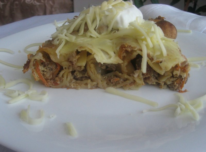 Curatam morcovul si ceapa si le dam pe razatoarea mica. 400 gr ciuperci le tocam cu robotul sau cu masina de carne si pe restul le lasam deoparte (o sa le punem deasupra).