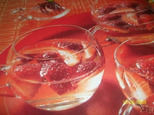 Spalati capsuni,lasati sa se scurga de apa si ii taiati in jumatate sau in 4 .Puneti capsuni intr-un bol de sticla cu zaharul.Varsati vinul alb peste capsuni si lasati la macerat in frigidel timp de 1 ora.Adaugati spumantul si mestecati incet.distribuiti capsuni in cupe de inghetata transpatente si serviti la masa cu lingurita si furculita.Pofta buna
