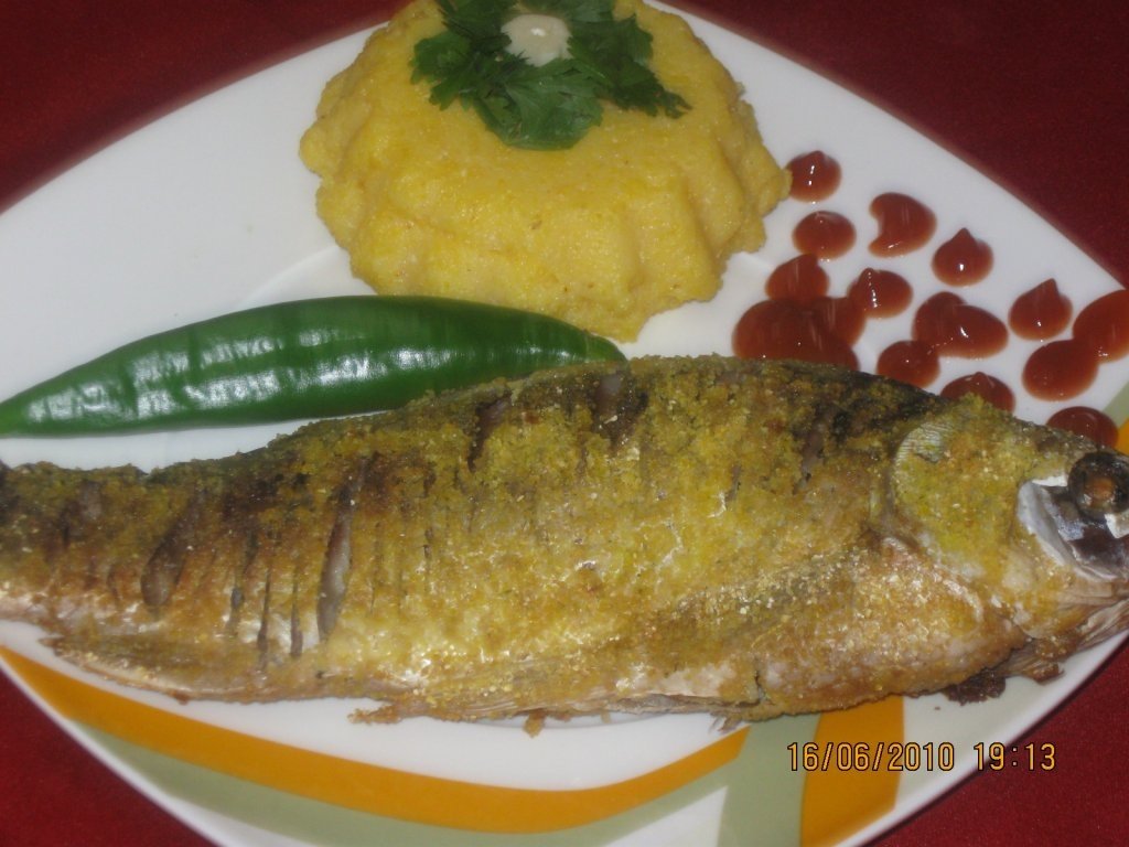 Se pun bucatile de peste intr-o tava si se da la cuptor.Cand sunt aproape gata facute , se desface folia de aluminiu si se mai lasa circa 10-15 min la cuptor pentru o buna rumenire.Se serveste cu mamaliguta si mujdei de usturoi.