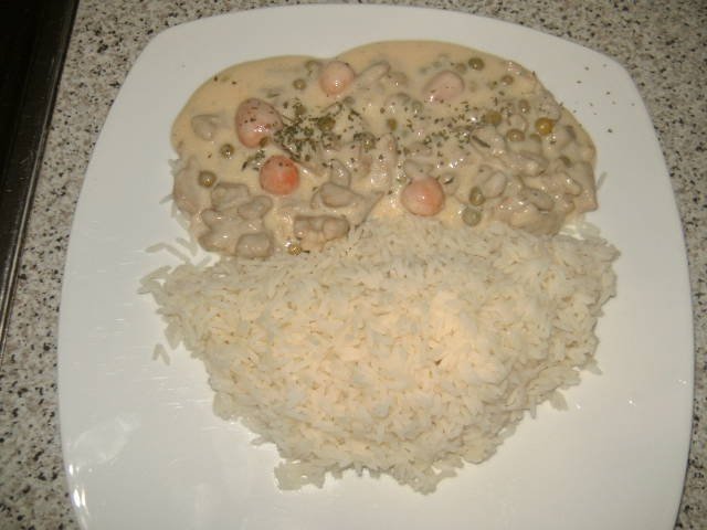 Carnea se condimenteaza cu piper si condimente pt. carne dupa care se prajeste in unt pana devine aurie, peste care se toarna smantana dulce lichida si se da intr-un clocot la foc mic, dupa care se ia de pe foc. Separat se fierbe orezul in apa sarata si se serveste ca garnitura. Eu am folosit din acela la pungute, cu bobul lung, care in 10 minute este gata. Se presara patrunjel tocat deasupra, de preferinta proaspat. Eu, neavand proaspat am folosit uscat. Pofta buna.