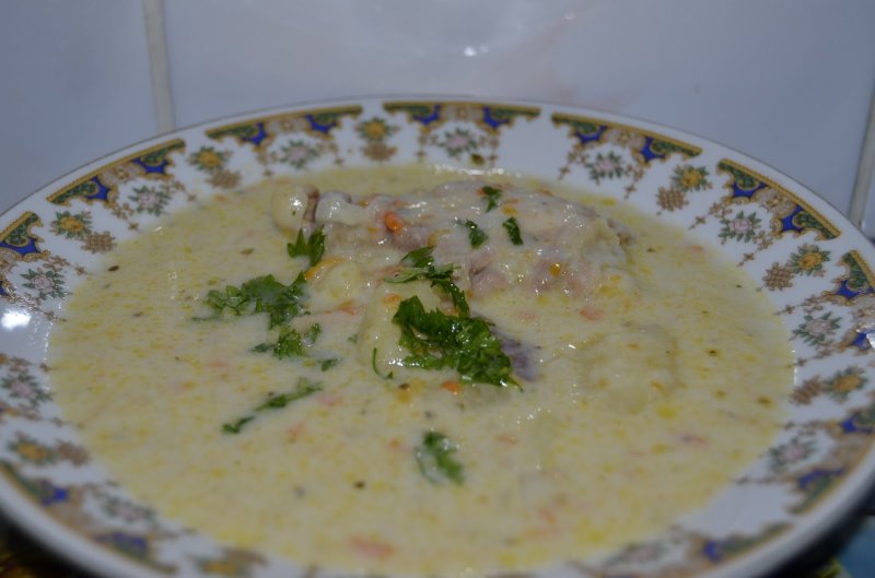 -Se curata ceapa,se toaca si se undeste,se adauga peste ea morcovul ras, pastarnacul tocat marunut si se undesc pret de cateva minute,cat sa lase putina culoare de la legume si sa se intrepatrunda gusturile,apoi se adauga carnea si se inabusa pana isi schimba culoarea.Se adauga apa,sare,cartofii,oregano,tarhonul si se fierbe totul la foc potrivit.Cand totul este fiert se pune intr-un vas faina, putina apa si se mixeaza,se ia cu polonicul supa din oala si se adauga peste faina mixand mereu sa nu se faca cocoloase,pana se obtine un sos se ce va turna in oala si se amesteca usor pret de cateva minute,apoi se opreste focul.La vreo 5 minute dupa ce se opreste focul se adauga smantana,asa sa nu se taie si sa capete aspect neplacut.Sa aveti pofta dragilor!