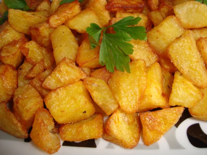 Intr-o tigaie punem uleiul la incins, adaugam cartofii si ii prajim, scuturand tigaia, pana devin aurii.