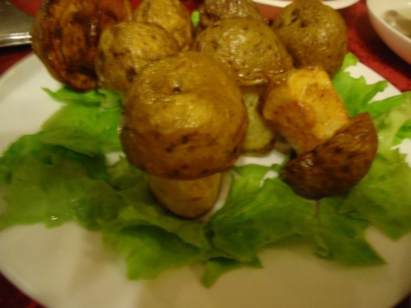 - Cu un cutit bine ascutit,scobesti fiecare cartof,dandu-i forma unei ciuperci.Palaria ciupercilor ramane in coaja care e comestibila.