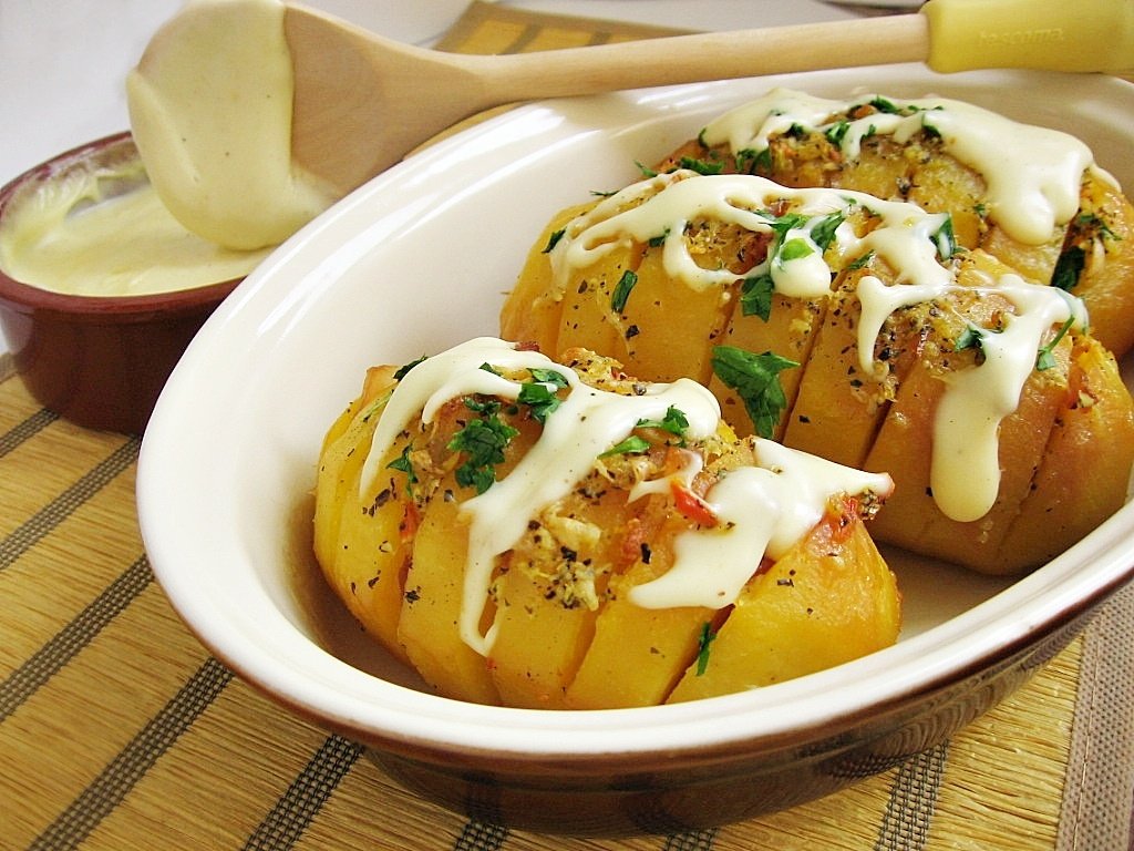 Reteta de cartofi copti cu mujdei si branza fondue. Cum se prepara reteta de cartofi copti cu mujdei si branza fondue.