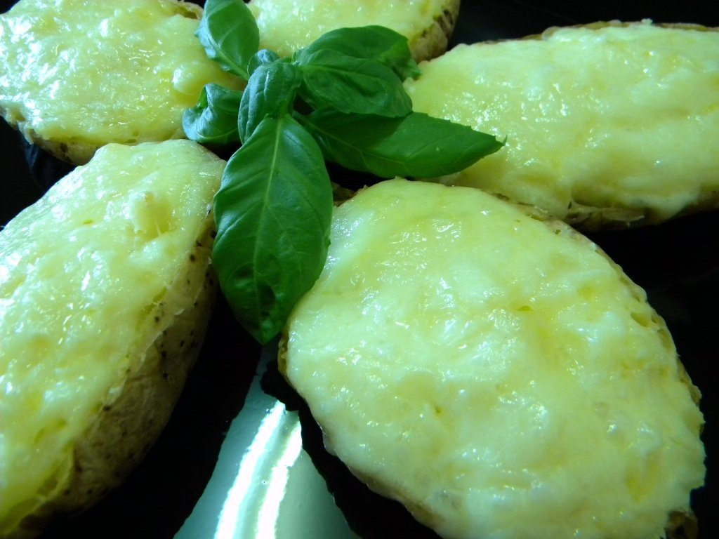 Se paseaza foarte bine branza,apoi se amesteca cu iaurtul sau smantana,untul,si miezul de la cartofi.Se omogenizeaza bine si se condimenteaza dupa gust.Cu acest amestec se umplu jumatatile de cartof ,iar desupra se pune cascavalul ras,si se mai dau la cuptor pentru 5 minute sa capete o culoare aurie.