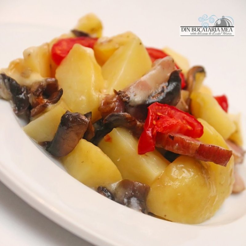 3. Ungem o forma (tava) cu unt. Punem jumatate din cartofii fierti in vas. Peste ei punem amestecul de ciuperci cu bacon si apoi cartofii ramasi. Peste acestia punem cascavalul ras si la urma ornam cu cateva rosii cherry.