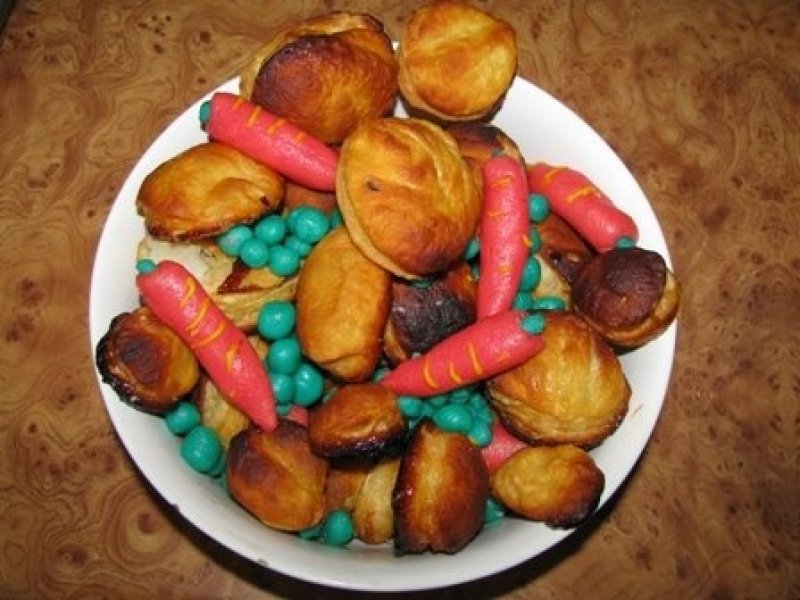 3.Se fac bilute din pasta de zahar verde (pentru mazare) , iar din pasta portocalie/rosie se formeaza morcovi, carora, pe urma, li se pun codita din pasta de zahar verde.